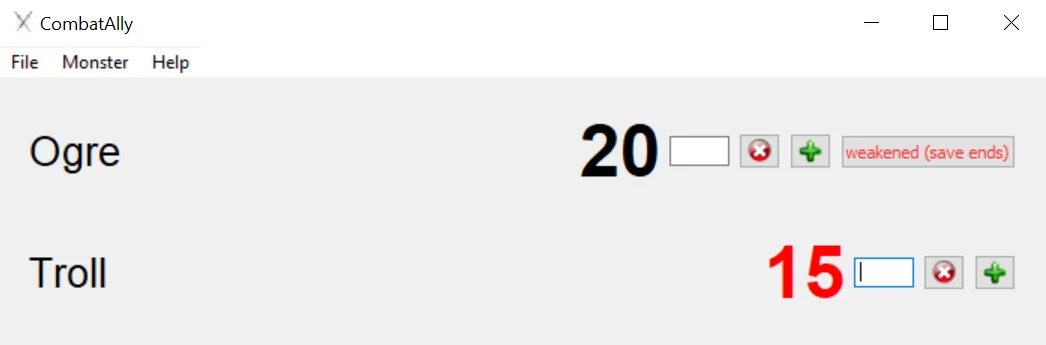 This application was designed to support a dungeon master when heading a Dungeons & Dragons 4th Edition session. In the application it is possible to add an arbitrary number of enemies and keep track of their original hitpoints, current hitpoints and afflictions. Based off the total and current hitpoints the bloodied stat is signaled, as well.